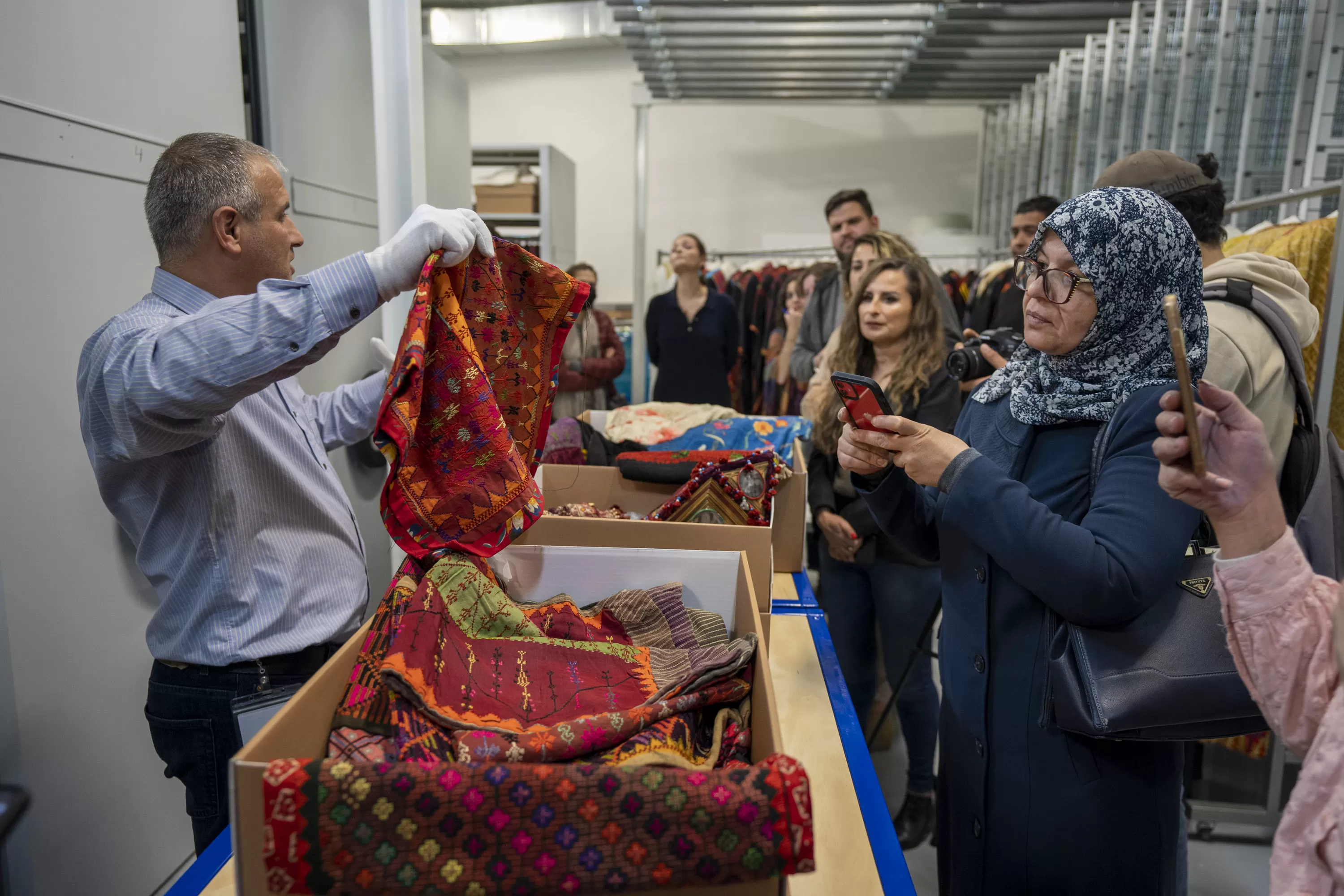 تأخذنا هذه الجولة إلى غرفة المجموعات، حيث نقترب من المجموعة الإثنوغرافيّة التي تضمّ أثوابًا فلسطينيّة مطرّزة وحُليًّا وإكسسوارات، إلى جانب الملصقات والأعمال الفنيّة التي تحفظ مشاهد من الحياة الفلسطينيّة عبر عقود. نتوقّف عند حكاية ثمانين ثوبًا ارتحلت إلى الولايات المتّحدة وحفظتها سيّدات فلسطينيّات وعربيّات–أمريكيّات، قبل أن تعود أخيرًا إلى فلسطين لتستقر في المتحف الفلسطيني.
