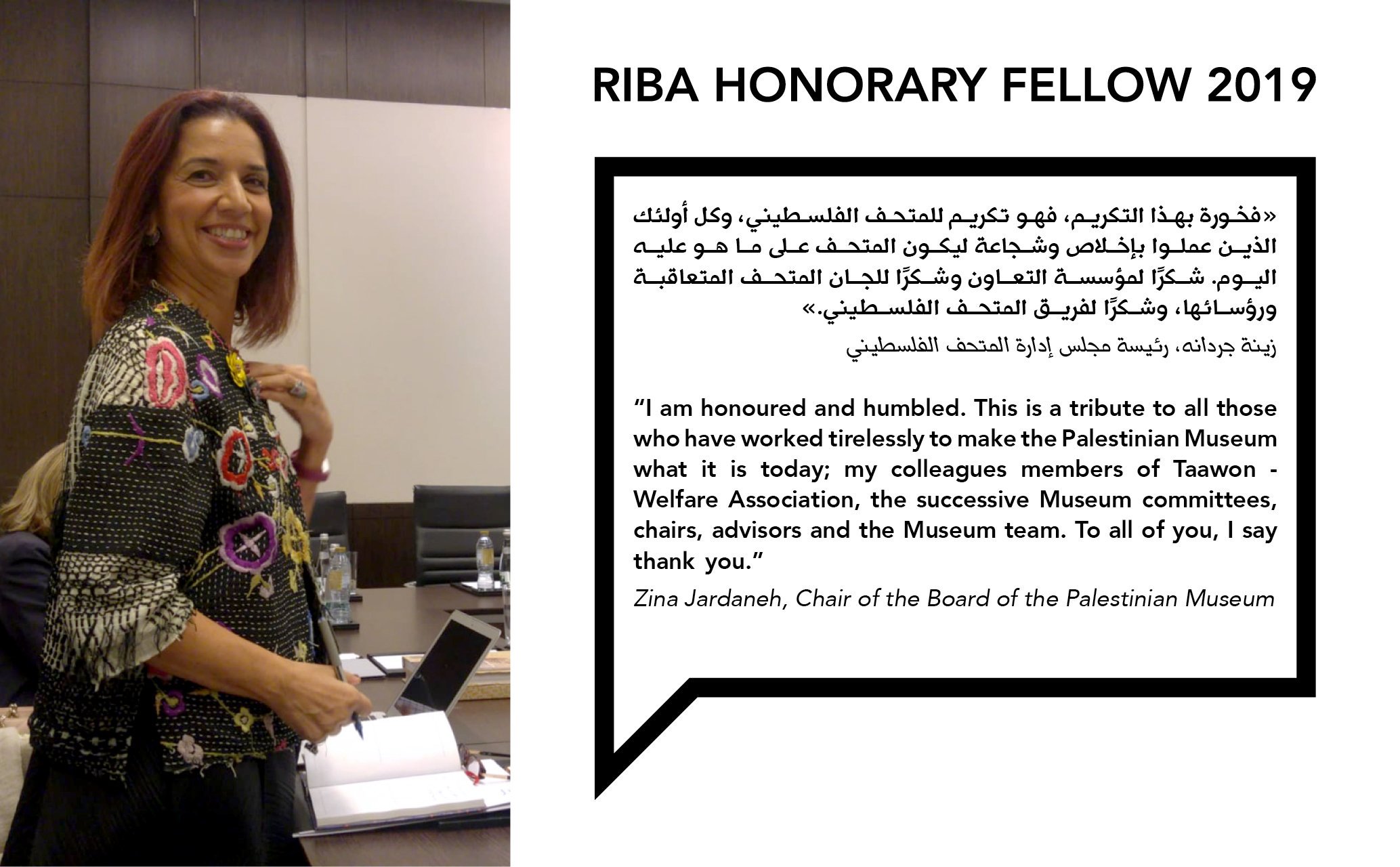 Zina Jardaneh, Chair of the Board of the Palestinian Museum, has been awarded an Honorary Fellowship by the Royal Institute of British Architects RIBA. RIBA Honorary Fellowships are awarded annually to people who are not architects but have contributed to architecture. This includes individuals who have advanced the role of architecture in creating more sustainable communities, those involved in its promotion and management and those who nurture the interests of future generations.