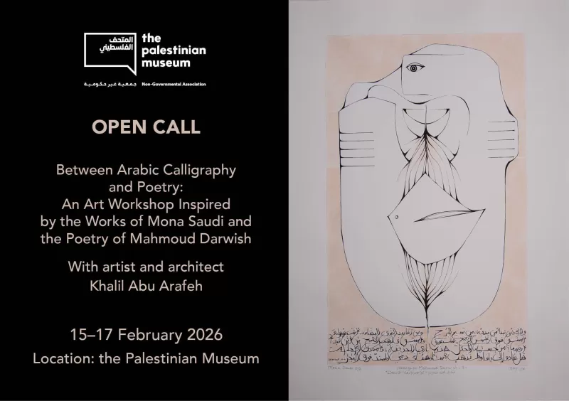 The Palestinian Museum invites emerging artists and art students to take part in an art workshop inspired by the poetry of Mahmoud Darwish and the work of artist Mona Saudi, as part of the Museum’s partnership in the exhibition The Dice Player, currently on view at Dar Al Hikma, Sharjah.