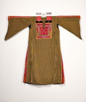 عقد (قلادة) من مرجان البحر الأحمر، مصنوع من أربعة خيطان مدموجة معًا، تتخلّله حبّات من العنبر وحبّات من الفضّة، وخرز بألوان الأزرق والأصفر والأحمر.