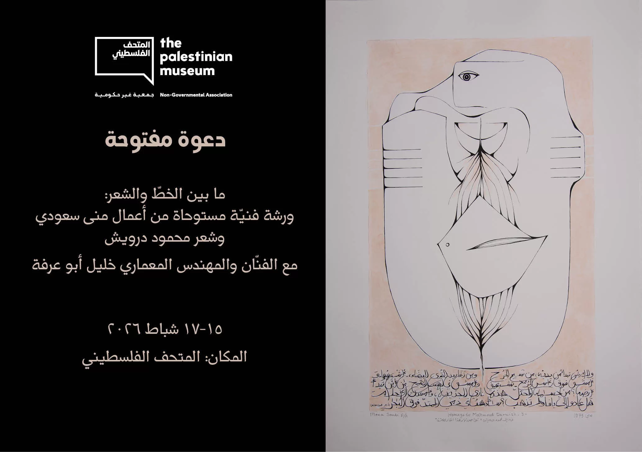 يسرّ المتحف الفلسطيني دعوة الفنّانين الناشئين وطلبة الفنون للمشاركة في ورشة فنيّة مستوحاة من أعمال الشاعر محمود درويش والفنّانة منى السعودي، وذلك ضمن شراكة المتحف في معرض "لاعب النرد" المُقام في دار الحكمة، الشارقة.