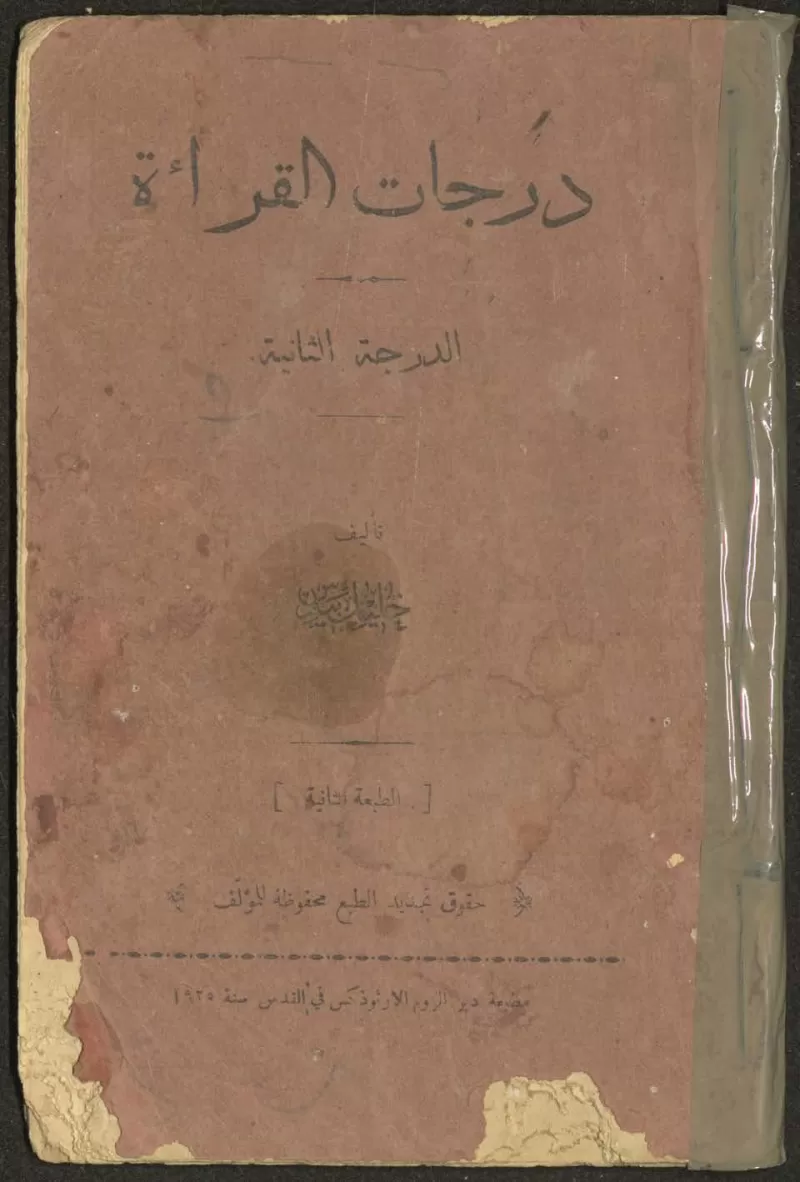 "Degrees of Reading," by Khalil Baydas was published in 1925 by the Greek Orthodox Monastery Press in Jerusalem and is 96 pages long.